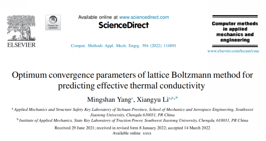近日,李翔宇教授团队对格子Boltzmann方法预测多相复合材料等效热导率这一数值方法做出了重要突破。在确保计算精度的同时,将该算法的计算效率提高了两到三个数量级。极端情况下,原本数十个小时才能完成的计算任务,改进后的算法仅需几分钟就能实现。该研究成果以“Optimum convergence parameters of lattice Boltzmann method for predicting effective thermal conductivity”为题发表在了国际计算力学领域的顶级期刊《Computer Methods in Applied Mechanics and Engineering》(中科院一区TOP,IF:6.756)。博士研究生杨名山为第一作者,李翔宇教授为通讯作者。