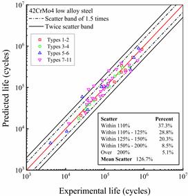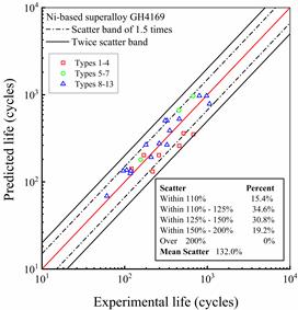 4)以GH4169镍基超合金的案例(图5)来评估所提出的方法对多轴热-机械疲劳寿命预测的适用性。结果表明:所提出的方法能较好考虑多轴载荷和变化温度之间的交互作用,81%的预测结果位于1.5倍误差带以内,平均预测精度为1.32倍误差(图6)。