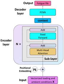 2)提出了一种新的基于自注意力机制的疲劳寿命预测方法(图2),该方法采取“解码器-编码器”的架构,实现了“加载历史和环境因素-疲劳寿命”的端到端建模。在编码层中,通过自注意力机制去解析整个输入的序列数据中不同节点的相关性,以考虑整个加载历史中各时间点材料状态(加载条件和环境因素)的关联,在此基础上提取加载历史和环境条件中与疲劳寿命相关联的深层特征(context);在解码层中,使用全连接神经网络建立该特征与疲劳寿命之间的映射关系。