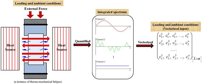 1)对于给定的材料系统,将其服役过程中的加载条件和环境因素特征集成在同一个矢量化的序列数据中,作为模型的输入(图1)。对于标量特征(如温度、腐蚀液浓度),可由单一通道表示;对于矢量特征(如多轴应力/应变状态),则需要用多个通道来描述其不同的分量。