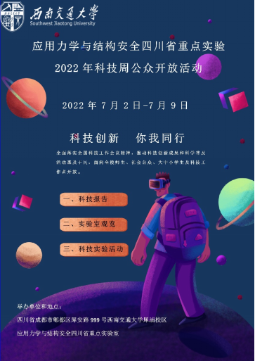 根据《四川省科学技术厅、中共四川省委宣传部、四川省科学技术协会关于举办2022年四川省科技活动周的通知》(川科奖[2022]3号)文件精神和要求,为全面落实全国科技工作会议精神,推动科技创新成果和科学普及活动惠及于民。2022年7月2-9日,8827太阳集团官网应用力学与结构安全四川省重点实验室结合自身特色和资源,面向全校师生、大中小学生、科研院所工作者和社会公众举办了“科技创新,你我同行”为主题的科技周公众开放活动。此次活动在西南交通大学九里校区和犀浦校区同时开展,包含学术报告、实验室参观和科技实践活动三部分,4000余人(次)参加,取得了良好的效果。