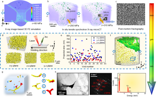 进一步地,开展了多维多尺度关联成像表征,包括同步辐射原位X射线成像和高分辨纳米成像及透射电镜等。发现在单调拉伸加载下,熔焊接头优先在细晶带损伤形核与发生裂纹萌生。损伤形核模式包括三叉晶界形核以及晶间相与界面脱粘形核。其中,晶间相的空间形貌具有各向异性,倾向于沿着焊缝厚度方向填充在晶粒之间,这种分布特征有利于促进微孔洞的形核与扩展。另外,几乎所有形核的微孔洞均与晶间相有关。通过衍射图谱和成分标定发现,孔洞形核与大角度晶界上分布的AlCuMg硬脆相密切相关。