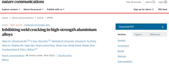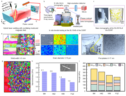 深入研究发现,细晶带内部的细小等轴非枝晶是以母材中高温稳定相经异质形核而成,适宜的温度梯度和熔池扰动共同决定了细晶带形成于HAZ区域。调节工艺参数能够改变细晶带的宽度,但无法完全消除细晶带。基于高分辨X射线原位多尺度关联成像技术,发现影响7050铝合金接头性能劣化的本质因素,探明了细晶带软化及沿晶失效机制,进而提出了一种全新的“激光扰动+磁场脉冲”联合制造策略,通过调控细晶带的区间分布,大幅提升了激光熔焊接头的强韧性,高于搅拌摩擦焊。相关成果以题为“Inhibiting weld cracking in high-strength aluminium alloys”发表在Nature Communications上,第一作者为西南交大牵引动力国家重点实验室胡雅楠博士(现为8827太阳集团官网讲师),通讯作者为吴圣川研究员(康国政团队,共同作者)、上海交大沈朝副教授(曾小勤团队,共同作者)及曼彻斯特大学Philip J. Withers两院院士,完成单位还包括西南交大(虞雨洭硕士生,张旭教授)、中科院金属所(郭翼研究员)、英国曼彻斯特大学(钟向莉高工)、牛津大学(Alexander M. Korsunsky教授,Sergio Lozano-Perez教授)、中科院上海光源(付亚楠研究员,肖体乔研究员)、中国航空制造技术研究院(车志刚研究员)和北京高能所北京光源(袁清习研究员)。