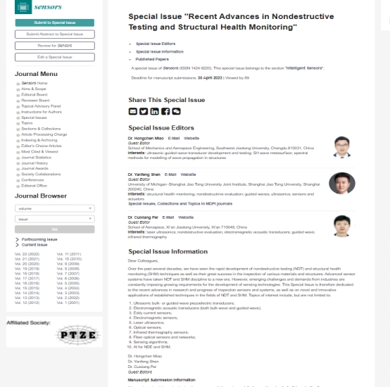 此外,苗鸿臣副教授还应邀担任《Sensors》期刊(2021年影响因子为3.847)的客座编辑(Guest Editor),与西安交通大学的裴翠祥副教授和上海交通大学的申岩峰副教授共同负责“无损检测和结构健康监测领域传感器研究的最新进展(Recent Advances in Nondestructive Testing and Structural Health Monitoring)”专题的组稿与评审工作。该专题的网址如下:https://www.mdpi.com/journal/sensors/special_issues/RMUA4Z6I8Q。