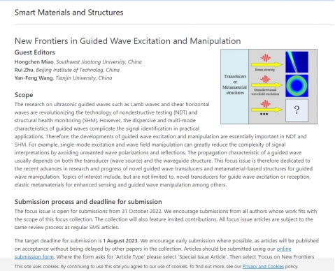 近日,太阳集团官网8827太阳集团官网苗鸿臣副教授受邀担任智能材料与结构力学领域权威期刊《Smart Materials and Structures》(2021年影响因子为4.131,太阳集团官网期刊分级为A类期刊,中国材料学会T1区期刊)客座编辑(Guest Editor)。苗鸿臣副教授将和北京理工大学朱睿教授及天津大学王艳锋副教授一起负责“导波激励与调控的前沿进展(New Frontiers in Guided Wave Excitation and Manipulation)”专题的组稿与评审工作。该专题的网址如下:https://iopscience.iop.org/journal/0964-1726/special/0964-1726_guided-wave-excitation-manuipulation。
