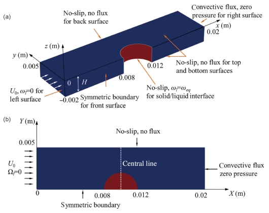 图1 (a)三维直接数值模拟和(b)二维数值模拟的Hele-Shaw单元形貌及相应边界条件。