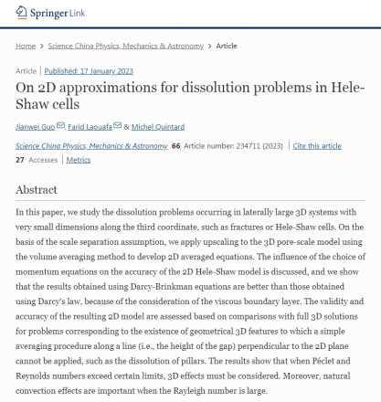 近日,我院青年教师郭建威作为第一作者和共同通讯作者,与法国国家工业环境与风险研究院Farid Laouafa教授和法国图卢兹大学-法国国家科学研究中心-图卢兹流体力学研究所Michel Quintard教授(国际多孔介质协会主席)在《中国科学:物理学 力学 天文学》英文版(SCIENCE CHINA Physics, Mechanics & Astronomy, SCPMA)合作发表文章“On 2D approximations for dissolution problems in Hele-Shaw cells”。