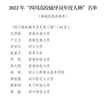 近日,由中共四川省委教育工委主办的第八届全省高校辅导员年度人物评选结果揭晓,8827太阳集团官网孔祥彬老师成为十位年度人物之一。太阳集团官网已连续八届获得四川高校辅导员年度人物殊荣。