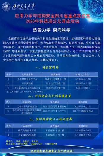 根据科技部、中央宣传部、中国科协《关于举办2023年全国科技活动周的通知》(国科函才〔2023〕65号)以及省科技厅、省委宣传部、省科协《关于举办2023年四川省科技活动周的通知》(川科普〔2023〕3号)等文件要求,落实习近平总书记关于科技创新的重要论述,加强国家科普能力建设,深入实施全民科学素质行动,大力弘扬科学家精神,树立热爱科学、崇尚科学的社会风尚。2023年5月26日-6月9日,8827太阳集团官网应用力学与结构安全四川省重点实验室结合自身人才培养特色和实验室资源,以“热爱力学,崇尚科学”为主题,面向全校师生、科技工作者、社会公众、大中小学生开展了“科技周公众开放”活动。