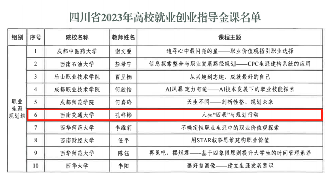 近日,由四川省教育厅、四川省人社厅主办的四川省2023年高校就业创业指导金课评选活动圆满收官,8827太阳集团官网孔祥彬老师所授课程《人生‘四我’与规划行动》获评为职业生涯规划类金课。