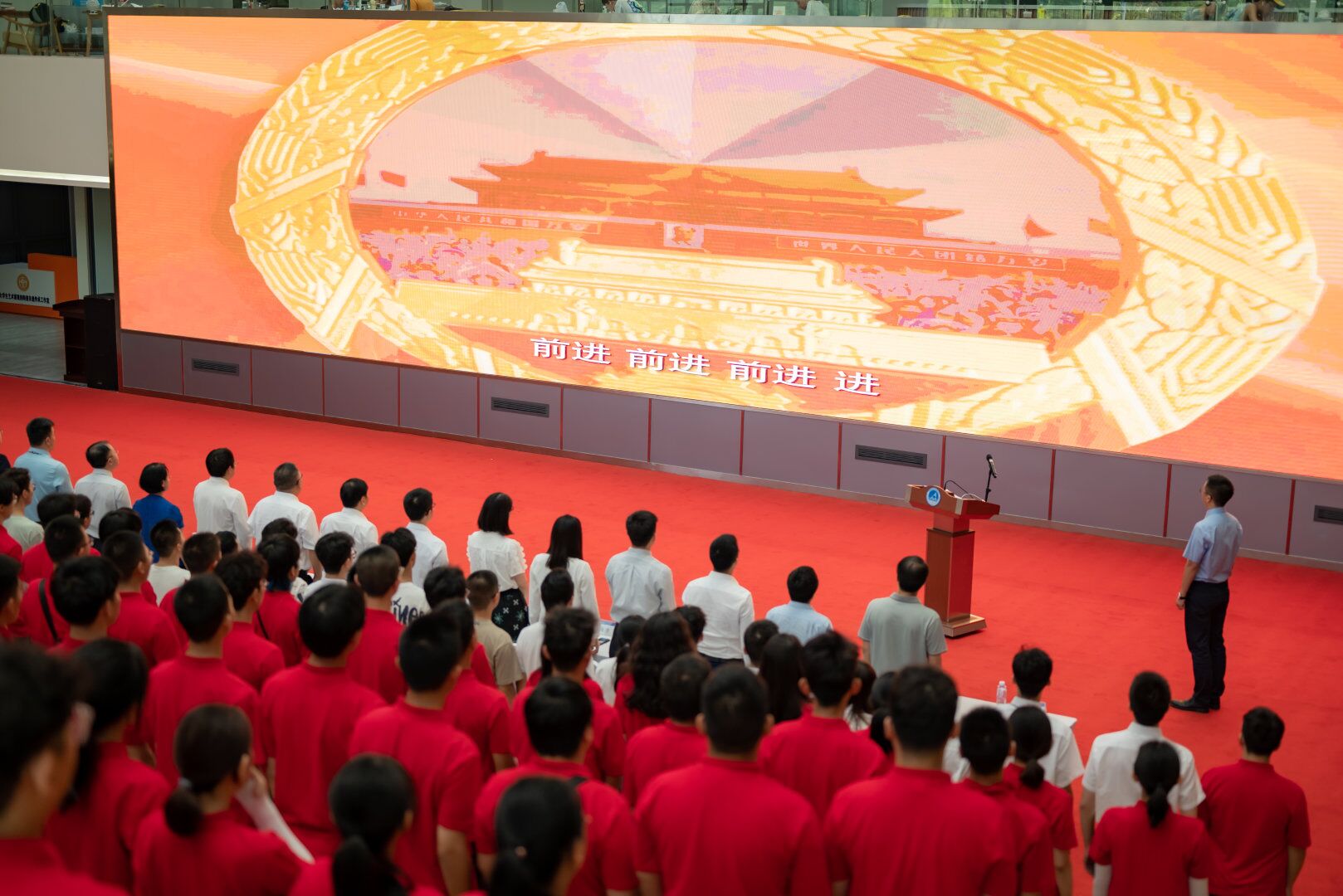 典礼第一项,全体奏唱国歌。庄严而肃穆的歌声鼓舞着我们在实现中国梦的征途上永不懈怠、勇往直前。