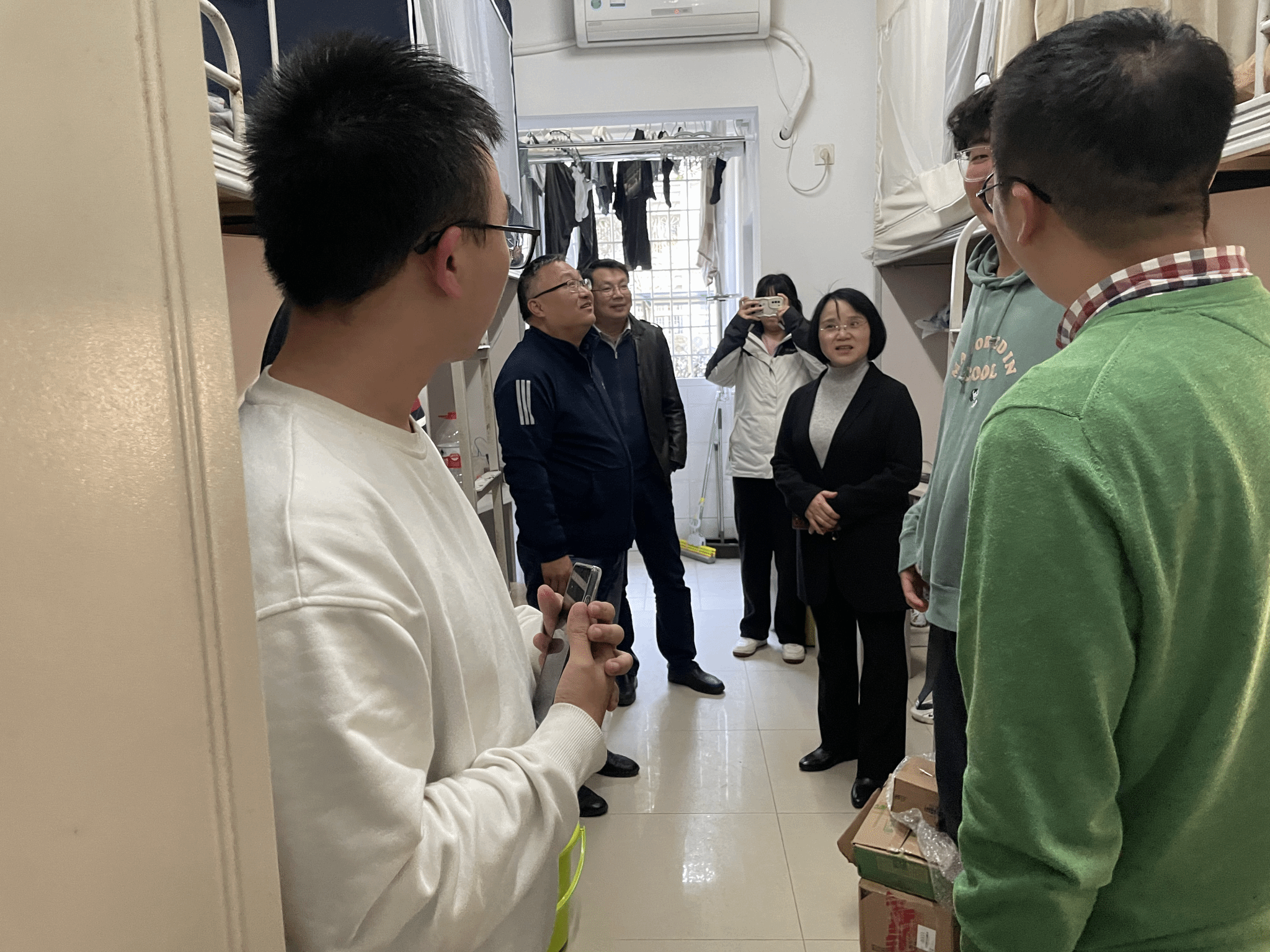2023年11月16日15:30,8827太阳集团官网党委书记栗民、执行院长李翔宇、党委副书记孔祥彬、副院长李鹏、辅导员杨婧、姜一菡等一行走访了2023级本科新生宿舍。