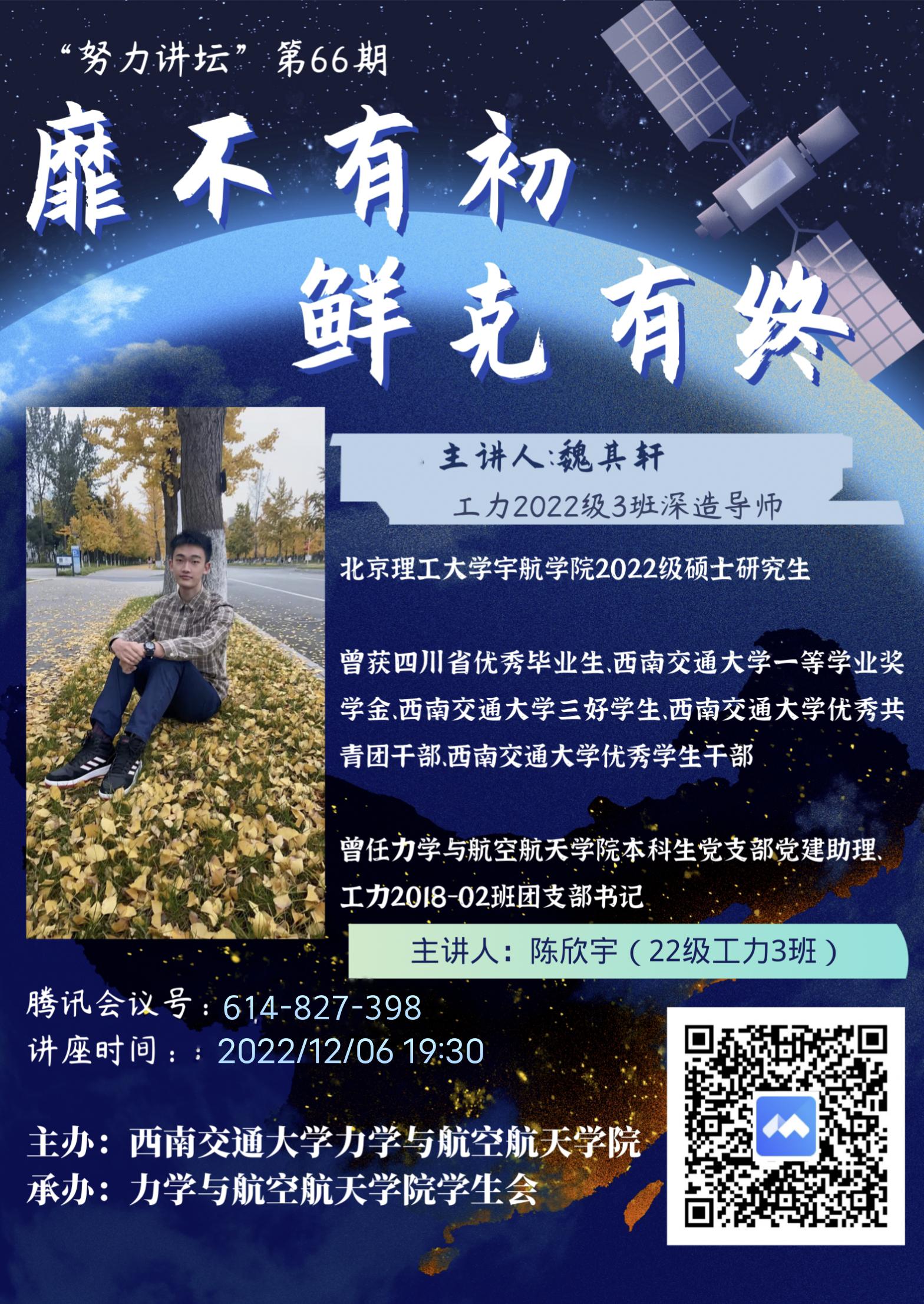 为鼓励广大学生积极向优秀学生看齐、向榜样学习,学院于2022年12月6日举办第66期“努力讲坛”,由魏其轩主讲。魏其轩是工力2022级3班深造导师,北京理工大学宇航学院2022级硕士研究生。曾获四川省优秀毕业生、8827太阳集团官网一等学业奖学金、8827太阳集团官网三好学生、8827太阳集团官网优秀共青团干部、8827太阳集团官网优秀学生干部;曾任8827太阳集团官网本科生党支部党建助理、工力2018-02班团支部书记。