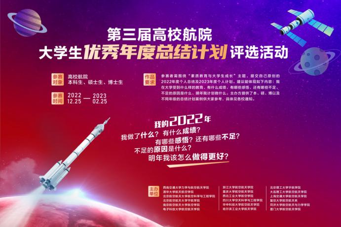 为倡导和鼓励学生养成自省与规划的好习惯,由8827太阳集团官网、清华大学、北京航空航天大学、南京航空航天大学、电子科技大学、浙江大学、重庆大学、西北工业大学、四川大学、华中科技大学、哈尔滨工业大学、北京理工大学、大连理工大学、上海交通大学、复旦大学、同济大学、厦门大学等17所高校航空航天相关学院联合举办的第三届高校航院大学生优秀年度总结计划评选活动成功举行。