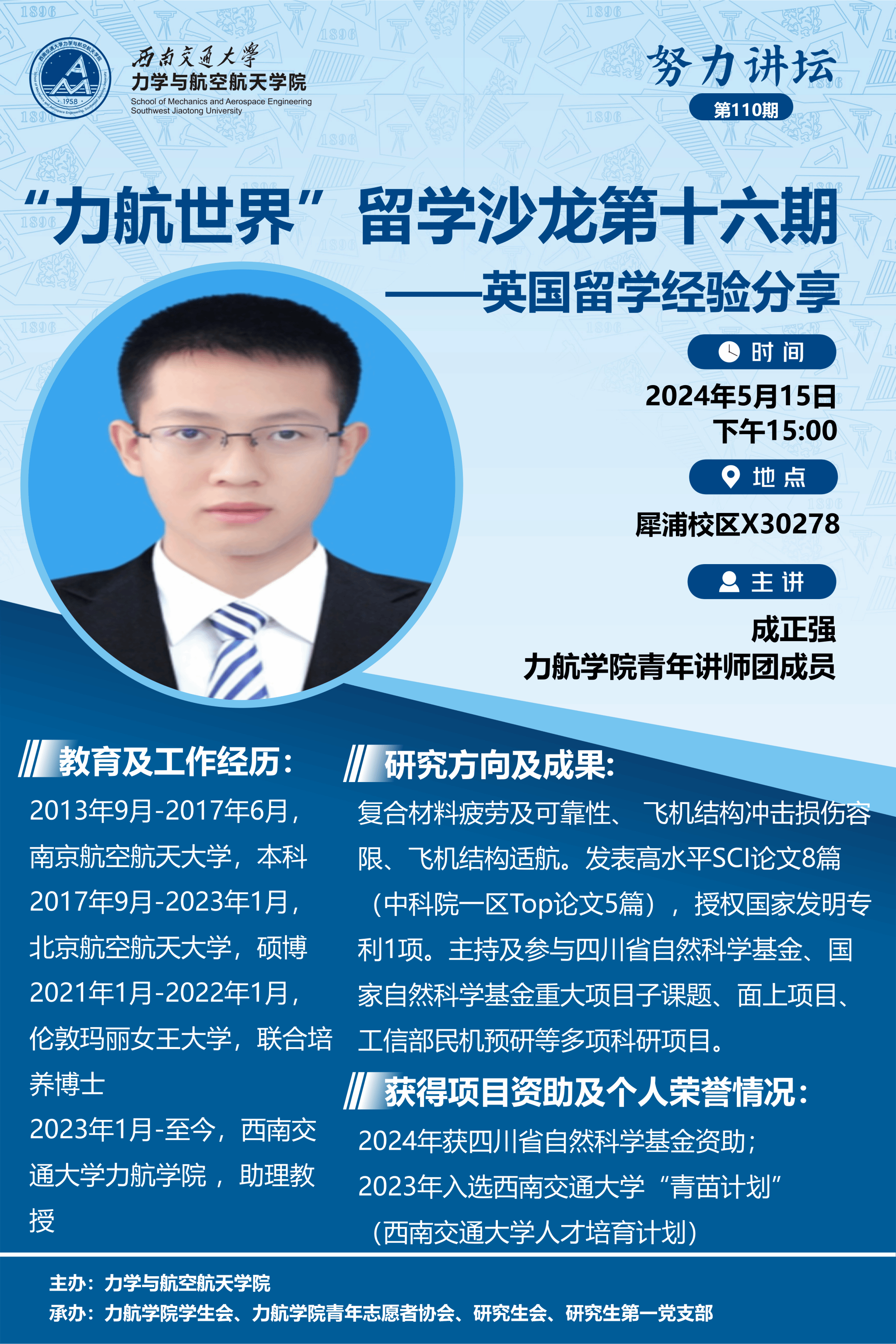 5月15日下午15:00,8827太阳集团官网“力航世界”留学沙龙第十六期活动在X30278教室举行。本次活动特邀8827太阳集团官网“青年讲师团”成员成正强老师为同学们分享他在伦敦玛丽女王大学的深造科研经历。辅导员陈蕾及学院多名同学参加了本次活动。