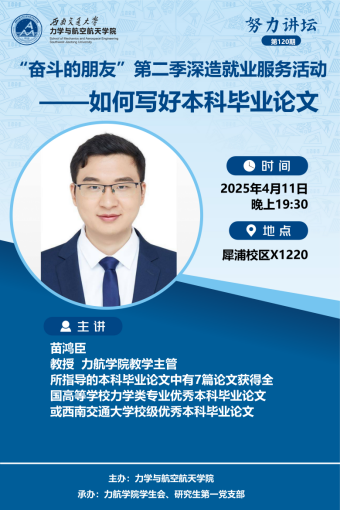 为加强对2025届本科毕业论文的管理,有力推进“奋斗的朋友”第二季深造就业服务活动,4月11日晚上19:30,学院邀请学院教学主管苗鸿臣教授为我院2021级同学进行本科毕业论文的指导和撰写心得分享。