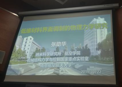 2019年11月22日,南京航空航天大学张助华教授来我院交流,开展了关于“低微材料界面调制的物理力学研究”的学术讲座。学术讲座由于超副教授主持,力学与工程学院院长康国政教授、于超副教授、张旭副教授、苗鸿臣副教授以及博士、硕士研究生参加了讲座。
