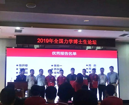 本次论坛分大会特邀报告和5个分会场报告。大会报告邀请了郑晓静院士、包为民院士、李家春院士和张东晓教授(美国工程院院士)。我院博士生陈开卷、谢曦、朱忠猛、陆晓翀和陆宋江参加了分会场的报告,每个分会场分别选取5个优秀报告。陈开卷博士和谢曦博士分别做了关于“超高分子量聚乙烯热-力耦合循环变形行为及其本构模型研究”、“超弹性镍钛形状记忆合金热-力耦合循环变形行为研究”的报告,并被评选为本次论坛的优秀报告。图2和图3分别为陈开卷和谢曦博士获得优秀报告的颁奖照片。
