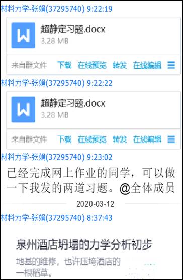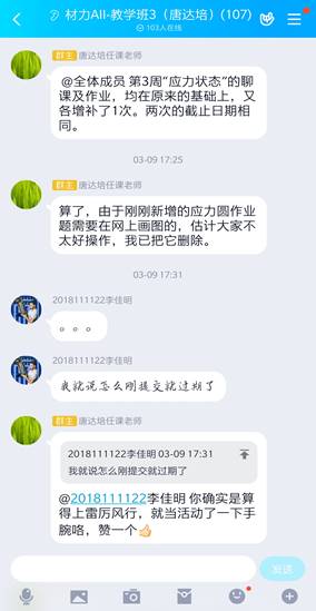每周上课时间段,老师都会要求同学们上课签到,若是没有课程安排老师也会守在QQ群中在线答疑。对于材料力学在线系统使用过程中可能出现的问题,老师都做了详细的视频讲解以及问题解决方案。对学有余力的同学,张老师还会在课堂作业之外额外布置思考题,或者推送有关于材料力学在生产生活中应用的小文章,以促进同学们对材料力学这门课程在深度和应用角度两方面的理解。