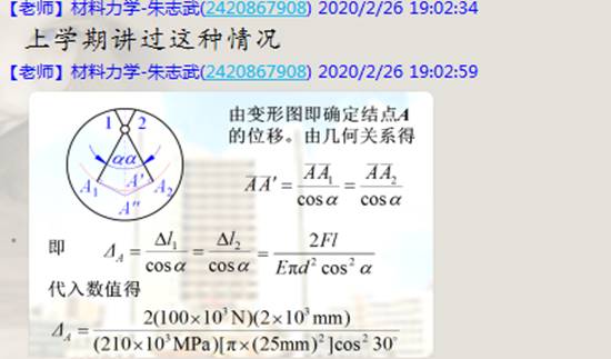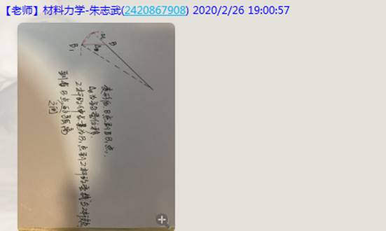 朱老师上课风趣幽默,老师会及时发布课程视频,同学们根据自身情况合理安排课程学习,疫情期间大家的材料力学主要在作业系统中完成学习,上课期间,朱老师在教学QQ群里积极地为大家答疑解惑,对于要作图分析的题目会画好图给同学讲解。