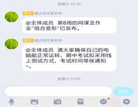 江老师上课前都会提前5分钟开启QQ视频通话,提醒同学们上课。上课主要是补充讲解学生系统的网课内容和知识点细节。由于大部分学生都没有带书,江老师会在群内发布电子版文件,也经常会讲解书后习题,江老师讲解问题非常细致,更加注重引导同学们思考更深层次的问题。虽然在线上教学,江老师随时开着QQ群以便沟通交流,QQ群也非常活跃,讨论问题的同学很多,江老师对同学们学习中的答疑总是很及时。