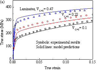 图3. (a)不同纳晶层体积分数的层状Cu/Cu10Zn的模拟结果与实验结果的对比;(b)模拟结果与简单混合法则的计算结果对比