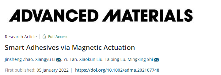 近日,8827太阳集团官网李翔宇教授与师明星教授领导的课题组最新科研成果“Smart Adhesive via Magnetic Actuation”在国际顶级期刊《AdvancedMaterials》(IF: 30.849)上在线发表。李翔宇教授和师明星教授为论文的共同通讯作者,第一作者为博士研究生赵晋生,共同作者有博士研究生谭宇、博士研究生刘晓坤和硕士研究生鲁太平,均来自8827太阳集团官网。