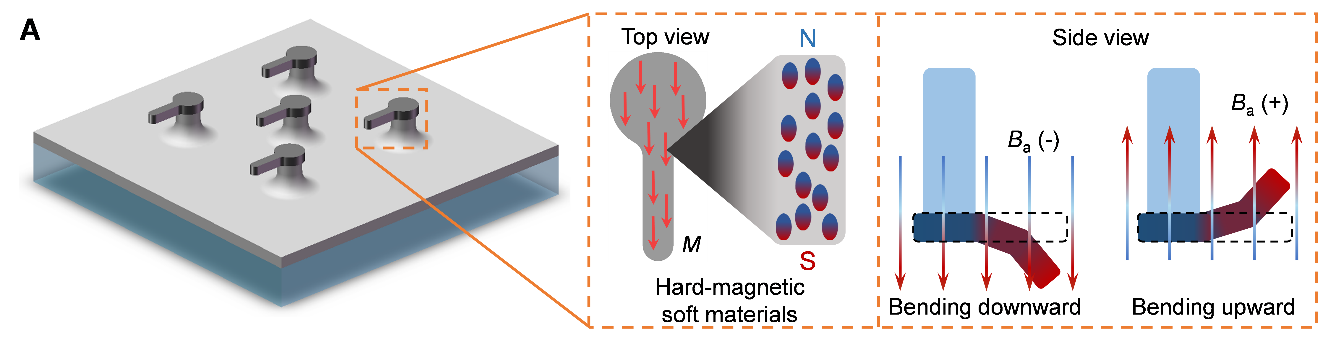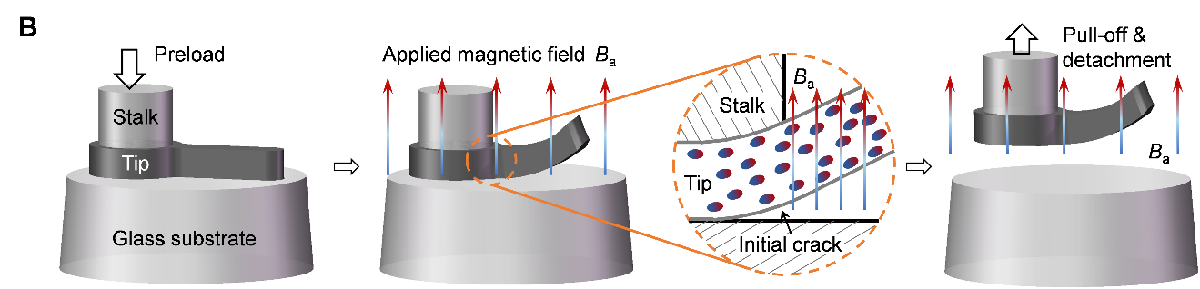 智能粘附材料已经广泛地应用于自动化装配系统、智能拾取与放置系统以及软体爬行机器人等领域,但是仍然存在粘附性调节能力弱、切换粘附响应时间长、应用范围小等局限性。该工作将仿生粘附材料和硬磁软材料相结合,开发出一种采用外加磁场驱动以控制表面结构的智能粘附材料。这种智能粘附材料通过表面结构的改变,能够实现在选择性拾取操作和拾取与放置操作中进行快速精确地切换粘附性。智能粘附材料的粘附性调节能力最高能够达到20倍以上,响应时间在0.5秒以内,可应用于干燥或者潮湿的工作环境中。