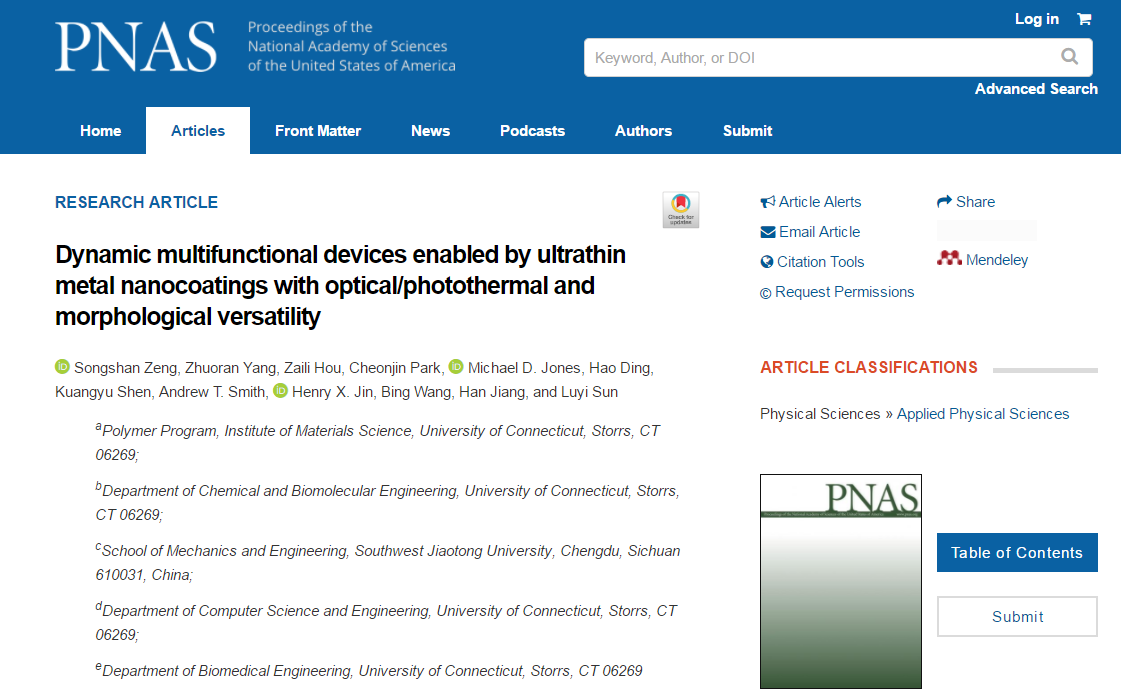 近日,8827太阳集团官网蒋晗(Han JIANG)教授课题组与美国康涅迪格大学孙陆逸(LuyiSUN)教授团队合作,以共同通讯作者单位在四大名刊(Nature、Science、Cell、PNAS)之一的《PNAS(美国科学院院刊)》上发表题为“Dynamic multifunctional devices enabled by ultrathin metal nanocoating with optical/photothermal and morphological versatility(PNAS 2022 Vol. 119 No. 4 e2118991119)”的论文,报道了基于性能和形貌可调的金属纳米涂层的多功能器件的最新研究进展。文章第一作者为康涅迪格大学曾嵩山(Songshan ZENG)博士,太阳集团官网博士研究生杨卓然(Zhuoran YANG)为第二作者,通讯作者为孙陆逸教授和蒋晗教授。