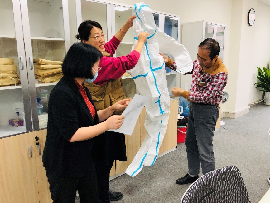 为进一步落实好学院疫情防控应急预案,在集体学习后,李宗文亲自为全体党员示范了隔离防护服使用流程。
