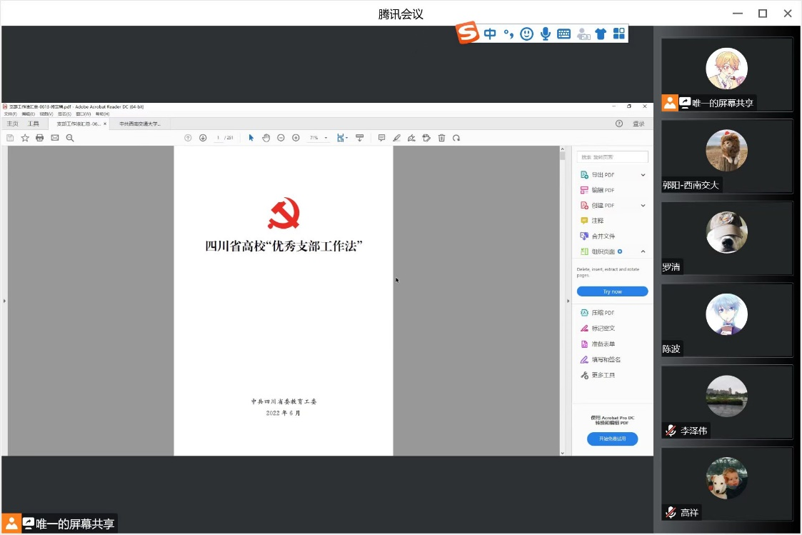 9月23日上午,8827太阳集团官网研究生第二党支部开展线上专题学习活动,学习内容为《四川省高校“优秀支部工作法”》部分节选内容,学习活动由支部书记杨宇康同志主持。