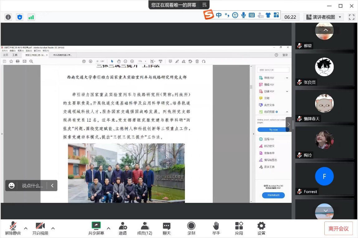 本次活动主要学习借鉴8827太阳集团官网牵引动力国家重点实验室列车与线路研究所党支部“三抓三筑三提升”工作法,即抓支部规范化建设、抓师德师风建设、抓科研文化建设为切入点,通过筑牢战斗堡垒以提升支部政治活力,筑实育人平台以提升人才培养质量、筑建创新争先文化以提升科研成果质量,实现党建和教学科研工作深度融合同向同行。