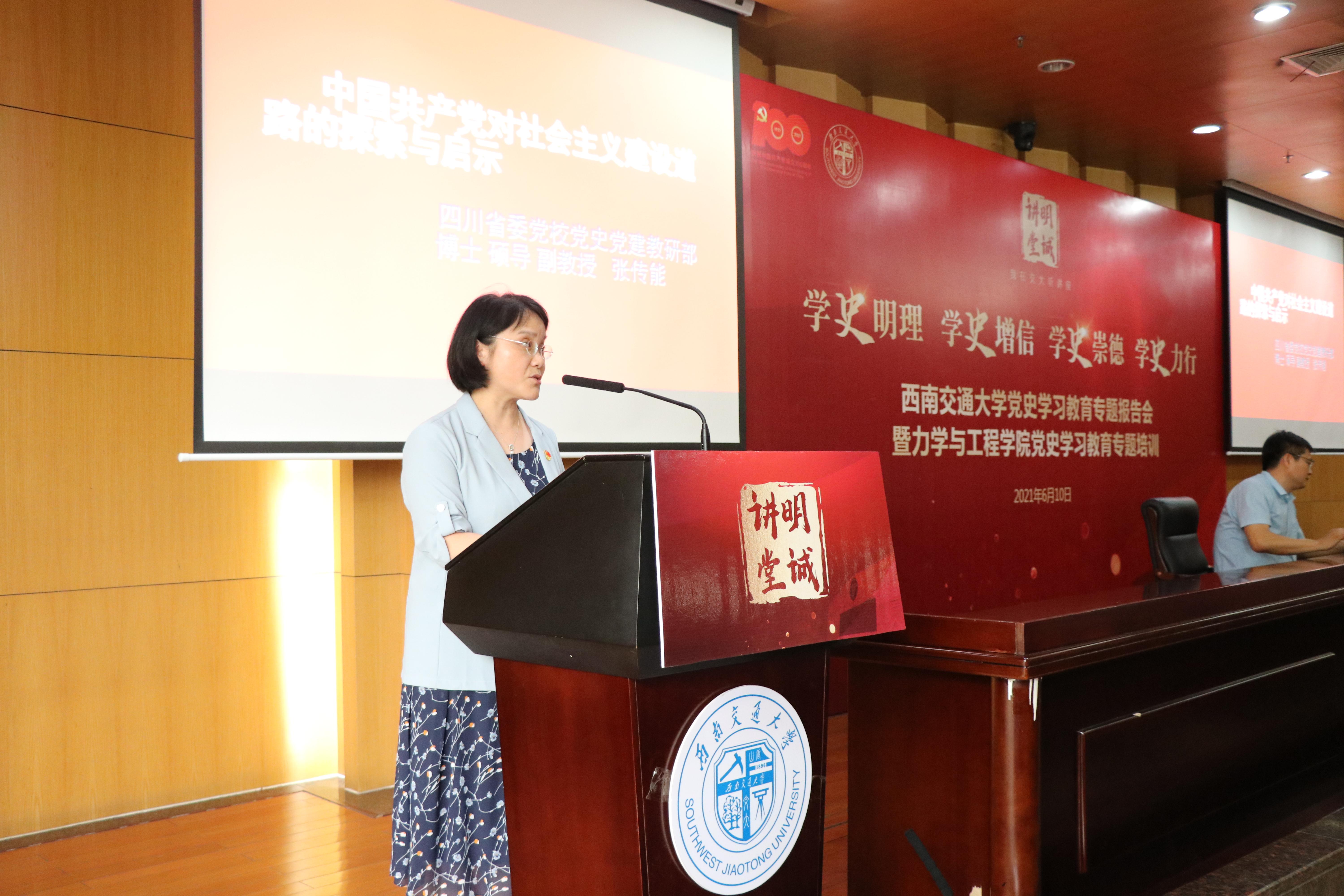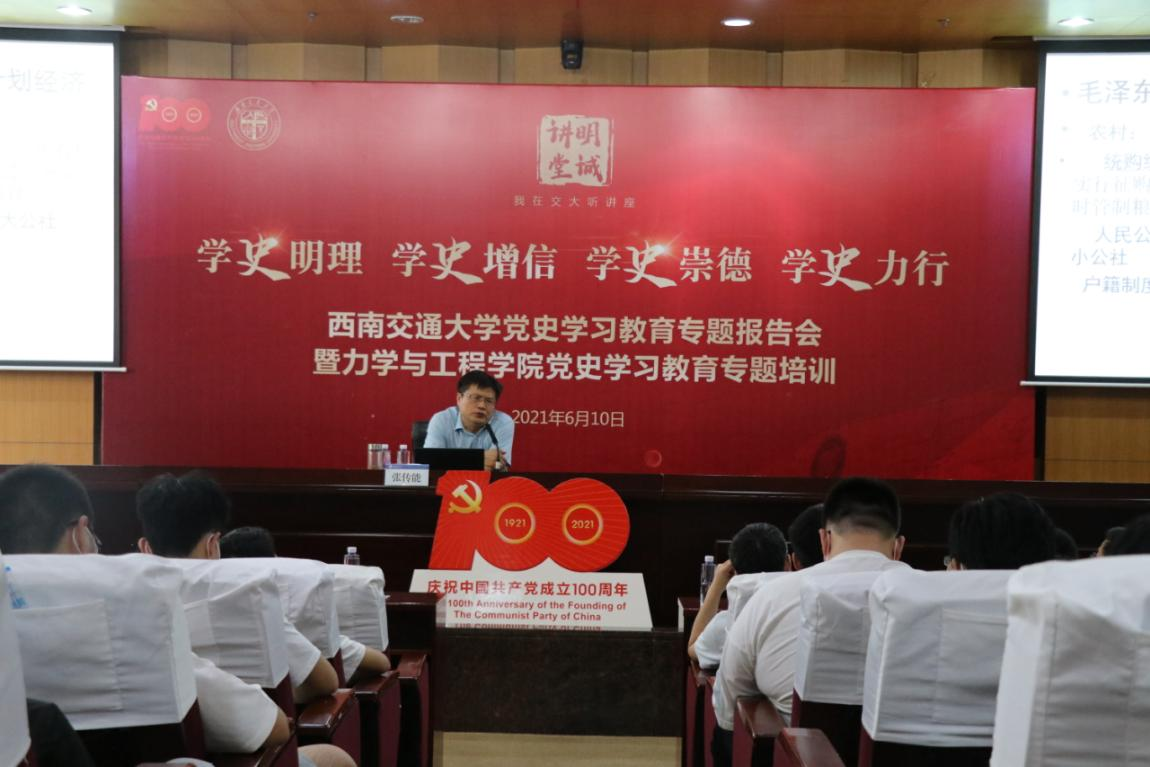 6月10日下午,8827太阳集团官网“明诚讲堂”党史学习教育专题报告会暨力学与工程学院党史学习教育专题培训在犀浦校区图书馆第二报告厅举行。中共四川省委党校教授张传能作了专题报告。本次报告会由党委宣传部和力学与工程学院党委联合举办,力学与工程学院党委书记栗民、院长康国政、学院其他领导班子成员、党委委员、各党支部书记及委员、师生近300人参加了此次报告会,学院党委书记栗民主持报告会。