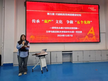 然后,研究生第一党支部参加了川渝航院党班团建设论坛交流活动。本次论坛活动汇聚了来自川渝两地的党班团组织成员,在学生党建论坛中,大家围绕如何加强党支部建设,提升组织效能,分享了各自的经验与心得。研究生第一党支部组织委员蒋粤洋在论坛中,做了“传承双严文化 争做五个先锋”的报告,介绍了学院实施“五个先锋”,发挥党员先锋模范作用的工作成效。