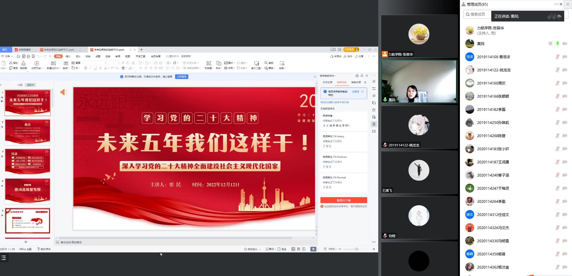 期间,学院党委书记栗民从未来五年“推动高质量发展”、“科技、人才、创新”、“推进法治中国建设”、“推进文化自信自强”、“提高人民生活品质”、“推动绿色发展”、“推进新时代党的建设新的伟大工程”等方面出发,联系学校第十五次党代会精神,结合力学与航空航天学科特点和学院特色,向师生党员作了“未来五年我们这样干!”——学习党的二十大精神主题报告。