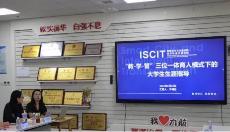 于博伦做了题为《“教-学-管”三位一体育人模式下的大学生生涯指导》的工作报告,介绍了智慧学院通过“教学协同、院院协同、院企协同、家校协同”把思想政治工作体系和教育教学体系、管理工作体系融为一体,分阶段开展做好学生生涯指导的工作方案。