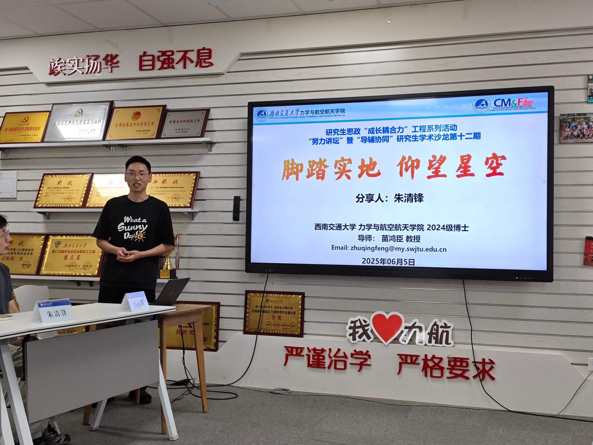 朱清锋以“脚踏实地,仰望星空”为题进行分享。他以自身科研过程中的案例为基础,提炼总结观点,比如,在科研初期不加判断地相信期刊文章,思维被局限,到定义专业领域的研究方法,回复审稿人意见的内容超50页,诠释了科研需要有“不怕事”的态度。