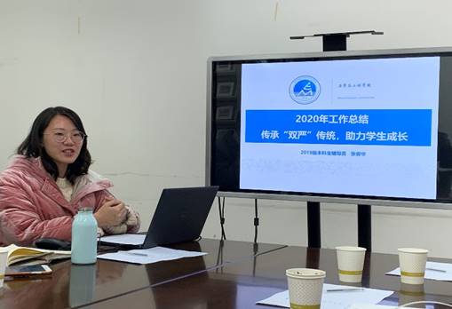 会上,各年级辅导员就2020年工作进行了年终述职:杨婧主要汇报了2019级本科生管理工作、学院学生工作、学院团委工作等;张英蓉以“在平凡中坚守初心,在平凡中陪伴成长”为题,汇报了研究生日常管理、深入学生联系学生以及党建等工作;张容华以“传承‘双严’传统、助力学生成长”为题,重点汇报了“双严”学风建设工作;胡持以“努力奋发创学风,力争上游助成才”为题,汇报了学生工作、防疫工作、党团工作等;刘科宏汇报了研究生日常管理和班团建设相关工作;周子涵和黄冠翔则各自汇报了2020级新生工作和专项工作。
