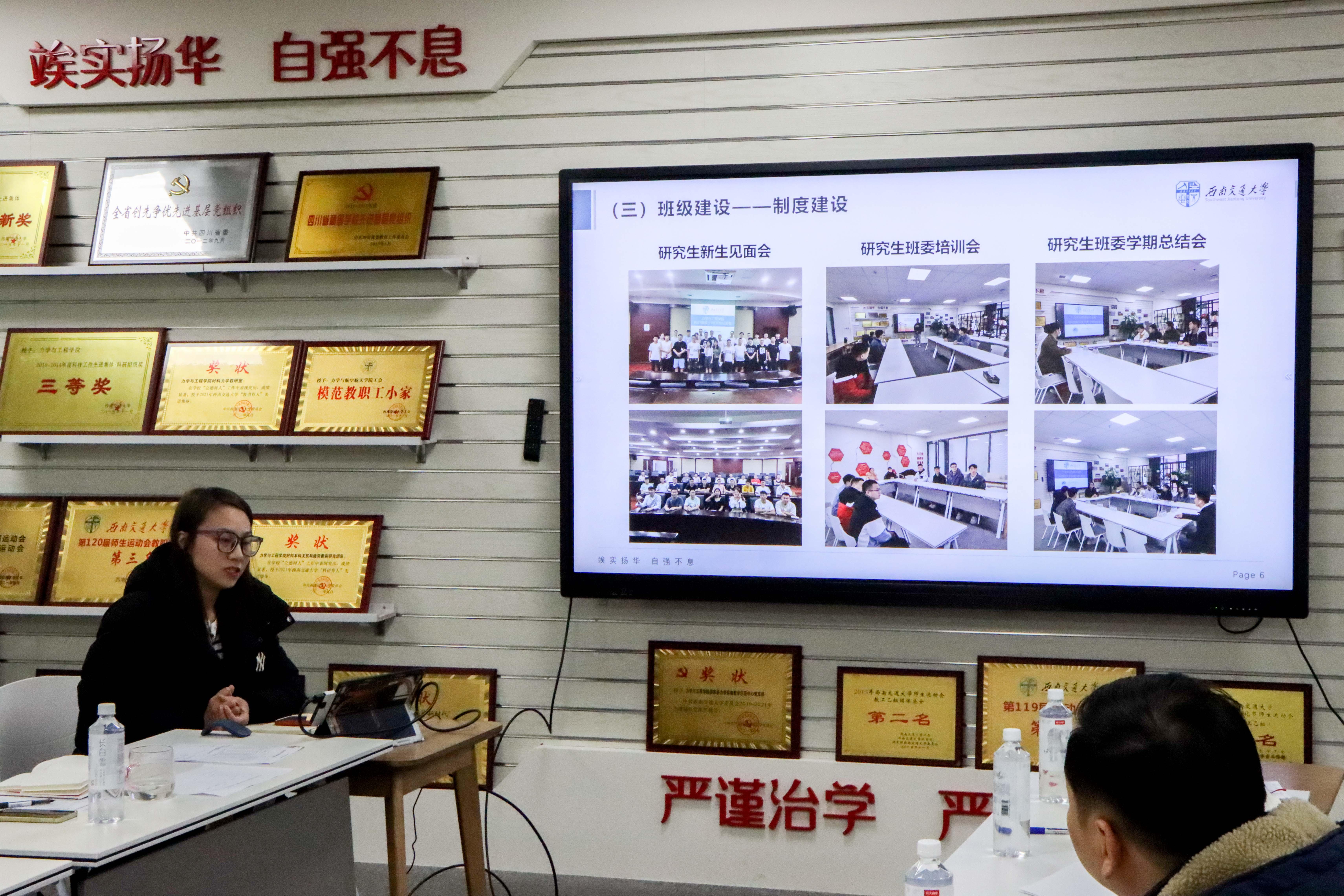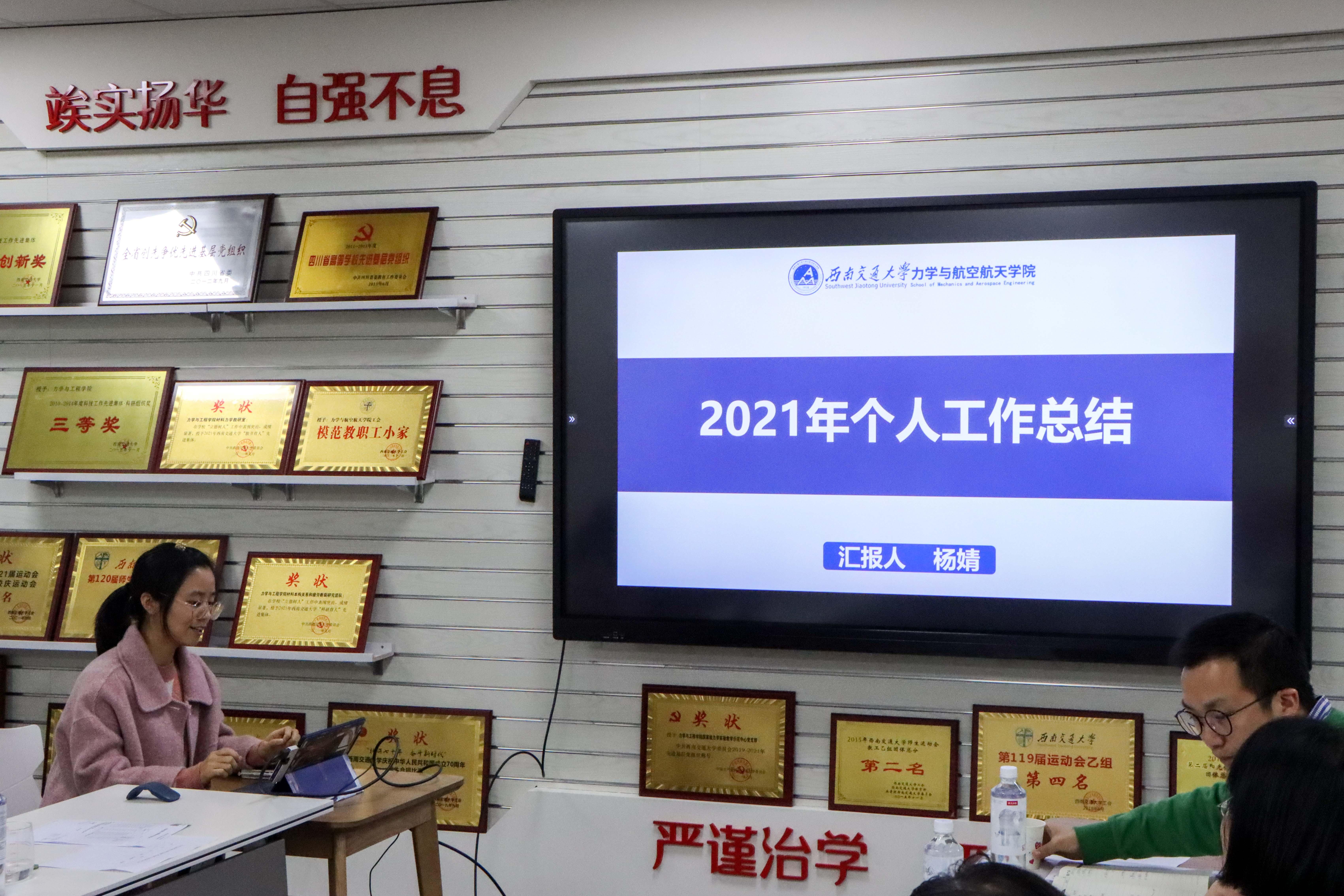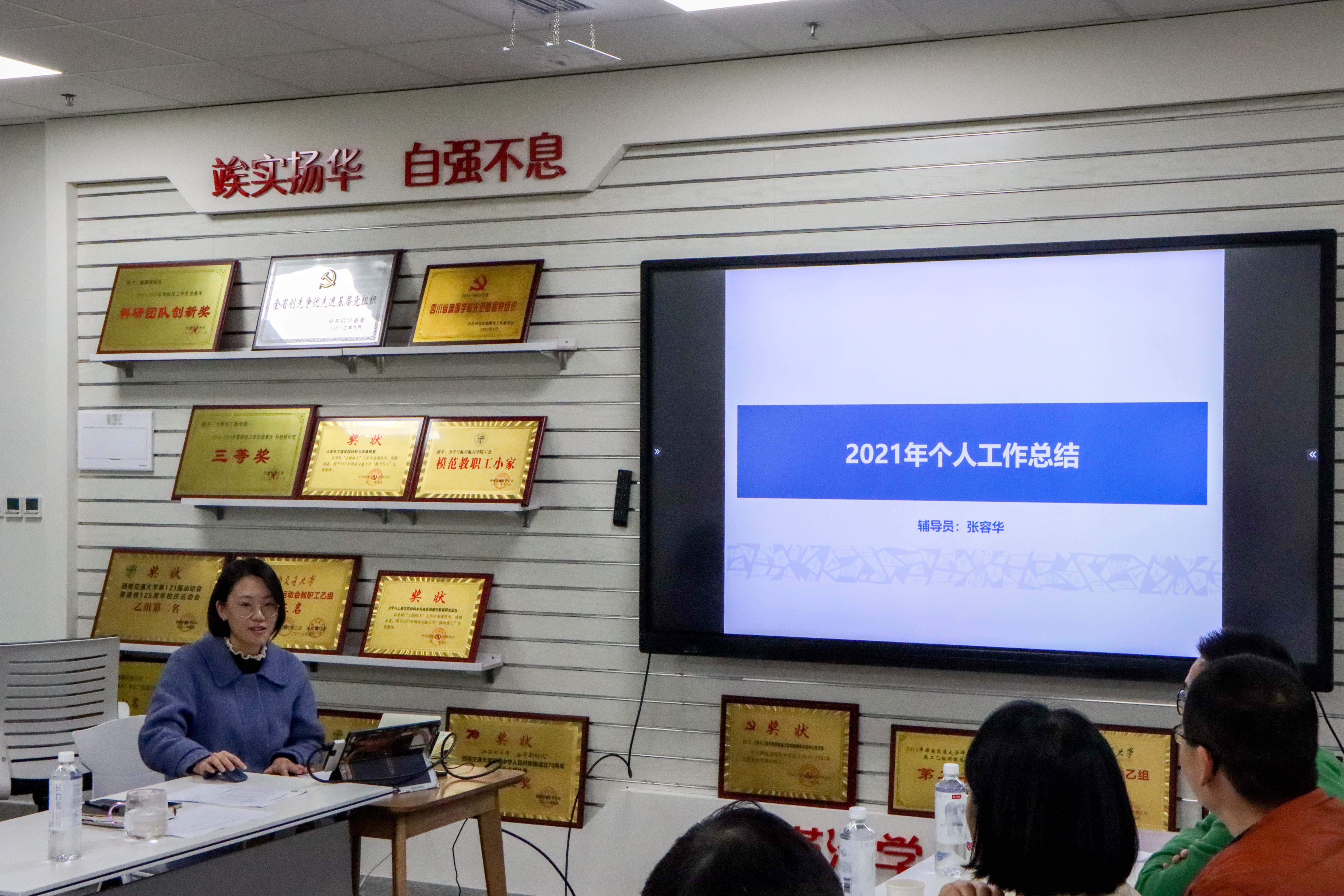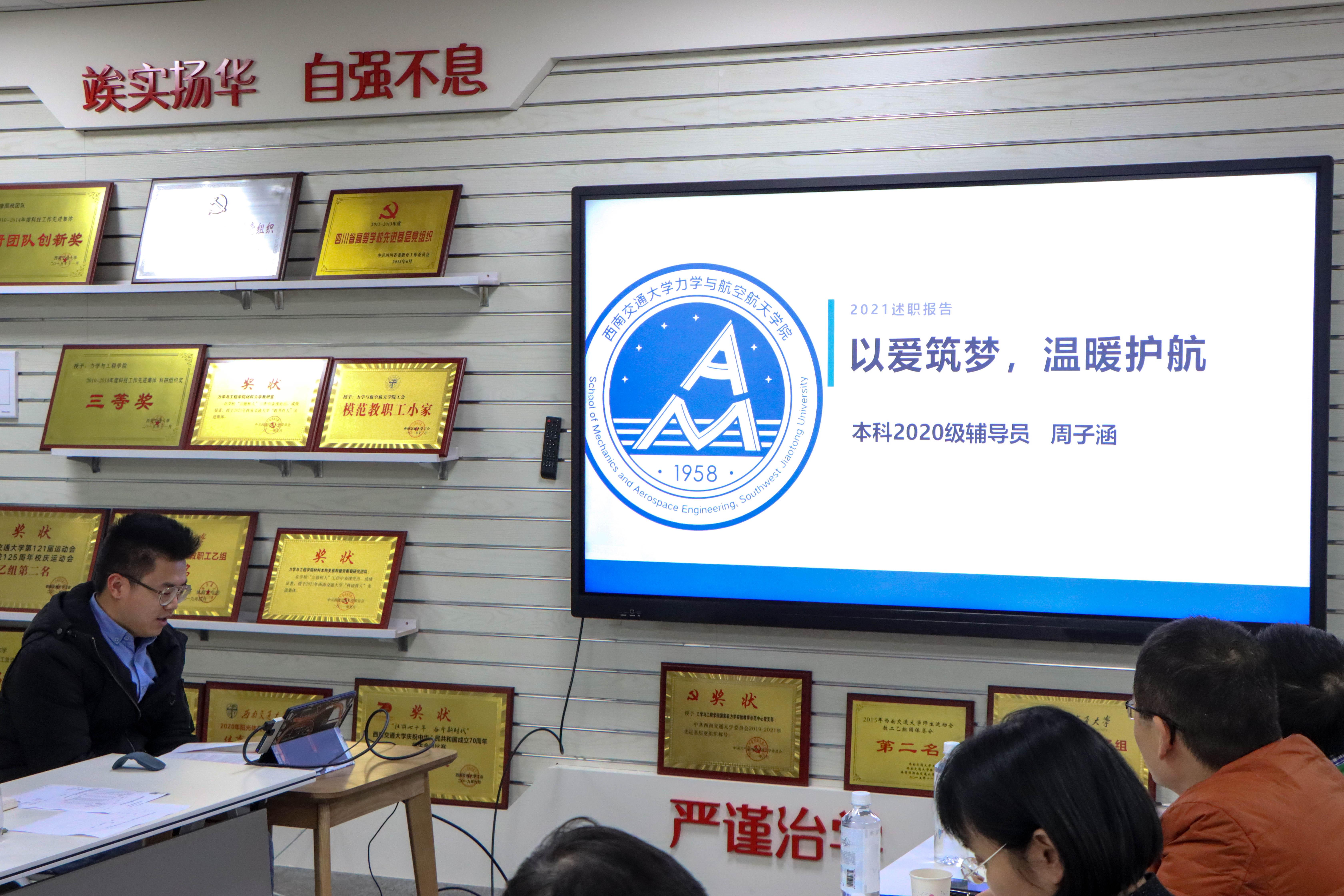 会上,各年级辅导员就2021年工作进行了年终述职:杨婧主要汇报了2019级本科生管理工作、学院学生工作、学院团委工作等;张容华汇报了学生思想理论教育、学生日常事务管理、学生学风建设工作、学生党建工作以及学生就业工作等;周子涵汇报了2020级本科生管理工作、疫情防控、科创竞赛、班风学风、社会实践、学生资助以及学院宣传等工作;王彪汇报了2021级新生、本科党建工作以及学院学风建设等专项工作;于红琴汇报了研究生辅导员工作和研究生会指导工作等;田甜汇报了2018级学生工作、团委工作以及学院宣传等其他专项工作。